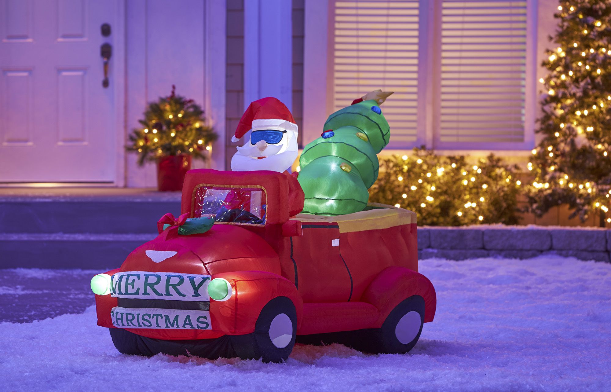 Table top decoration of a snowman in the back a red white silver and green truck The snowman is wearing a hat and scarf that are white and red along with green gloves There is a tree in the bed of the truck right next to the snowman Windows of the truck illuminate with LED lighting LED lights use 90 less energy. 8ft Air Blown Inflatable Santas Christmas Tree Delivery Truck wReindeer Yard Decoration GTC81103-8. AsterOutdoor 6ft Christmas Decorations Inflatable Claus Blow Up Built-in LED Outdoor Indoor Yard Lighted for Holiday Season Quick Air Blown 6 Foot High Santa wHelicopter 44 out of 5 stars 291.